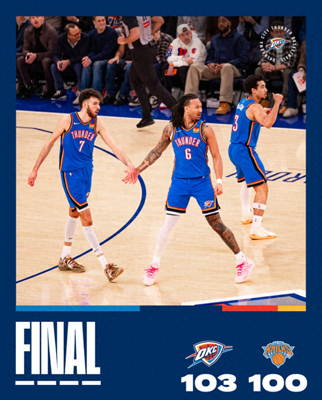 这场比赛亚历山大与霍姆格伦都拿到20+的数据,在末节亚历山大3中2+三分1中1+罚球2中2拿到7分1助攻,他在末节1分16秒的三分球是杀死比赛的一击。