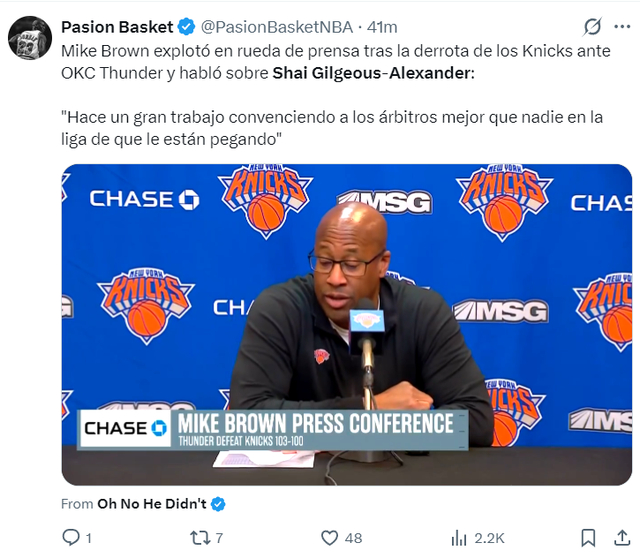 赛后迈克-布朗这样评价SGA:他在让裁判相信他造犯规成功这个方面的确非常出色,联盟里没有人能比得过他。(嘲讽亚历山大是碰瓷王、罚球王)