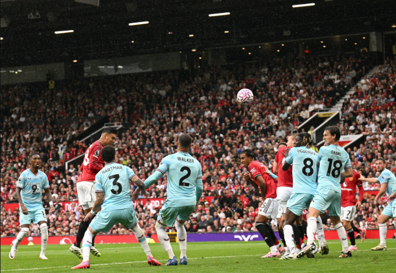 第20分钟芒特带球突入禁区摔倒,主裁判吹罚点球,但是在回看VAR后取消了此前的判罚,狂攻不止的曼联,在第26分钟打破场上平衡,卡塞米罗禁区内的头球击中横梁,皮球反弹到防守球员身上后入网,靠着对手的乌龙,红魔在主场取得了1-0的领先,半场结束前,芒特大禁区内的回头望月击中横梁出了底线。